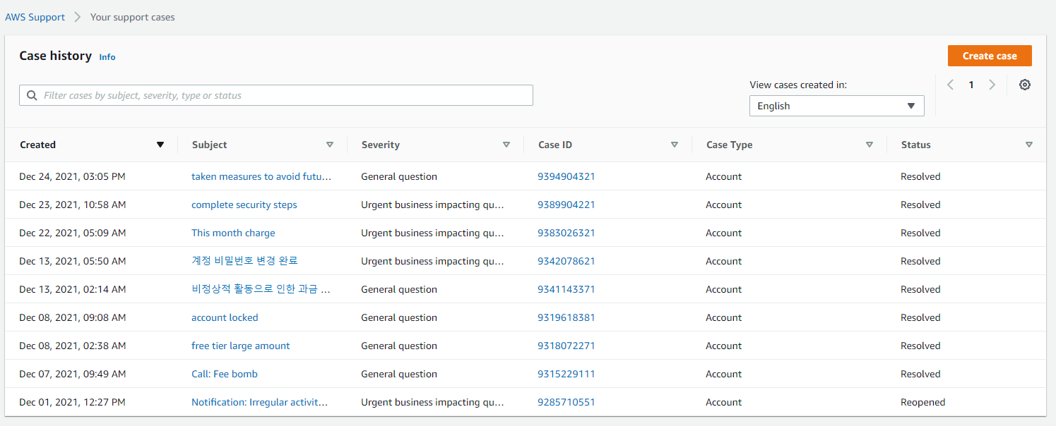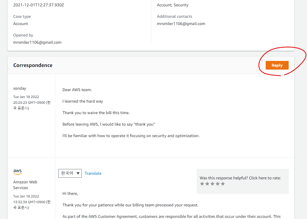 과금 청구건으로 문의 요청해야한다면 빠른 처리를위해 맨위에 캡처 이미지처럼 여러개 CASE를 생성하지 말자. 동일주제에 답변받을 때마다 새로운 문의 CASE를 열어서 작성하는 경우 다른 담당자가 이전 이력도 확인이 안되서 Support team으로부터 답변이나 대응에 지연될 수있다고 피드백을 받았다. 아래 사진처럼 상세 내역에 응답(Correspondence) 오른쪽 영을 보면 Reply로 요청 사항에 대한 답변이나 추가문의를 진행했다면 1달도 안걸렸을 것이라고 생각한다.